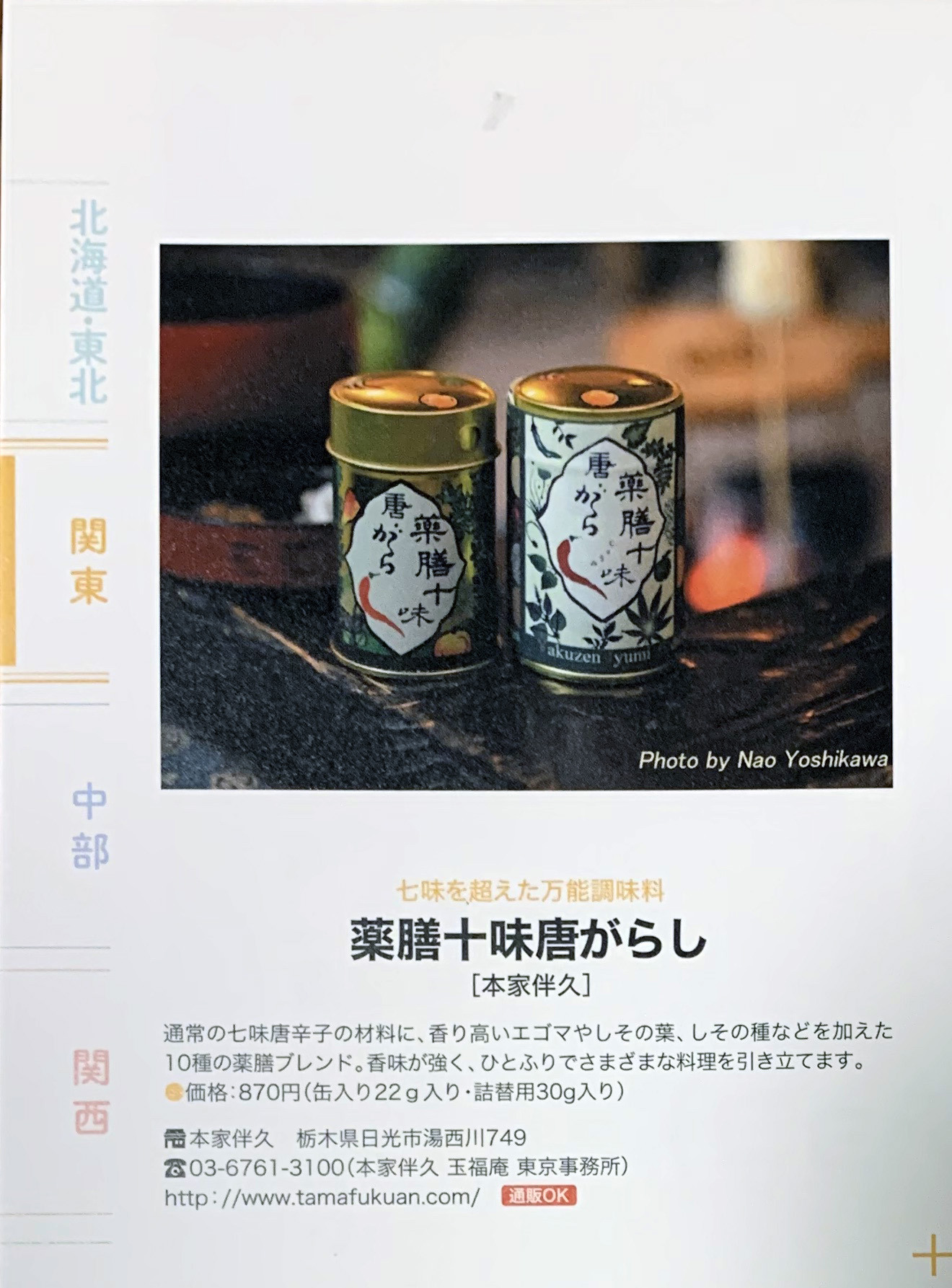 薬膳十味唐がらしが、七味を超えた万能調味料として、「行政・観光協会アンテナショップの担当者が推す!手みやげ&お取り寄せ2020」の雑誌(八重洲出版)に掲載していただきました。各県の名物が掲載されたとても素敵な御本ですので、本屋さんやネット本屋さんで販売されていますので、良かったらご覧くださいませ。